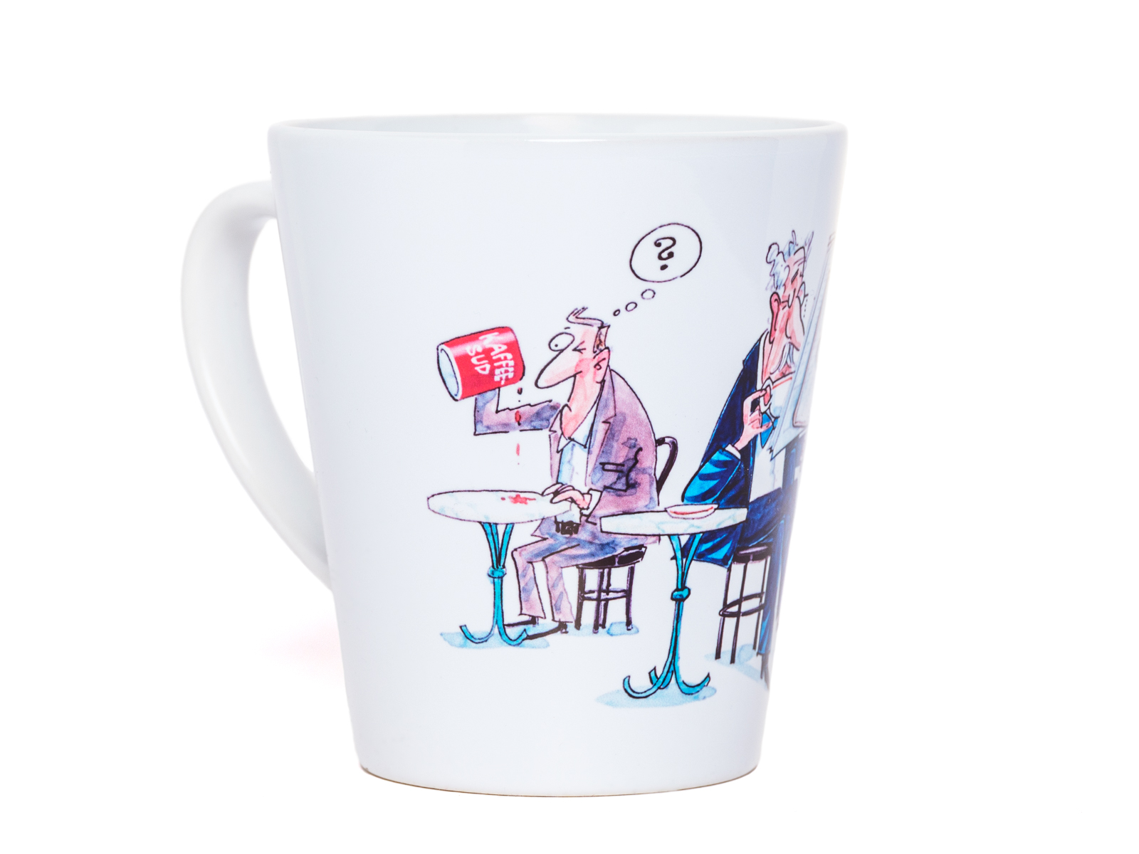 Keramiktasse in weiß, mit Henkel und Zeichnung von SN-Karikaturist Thomas Wizany.